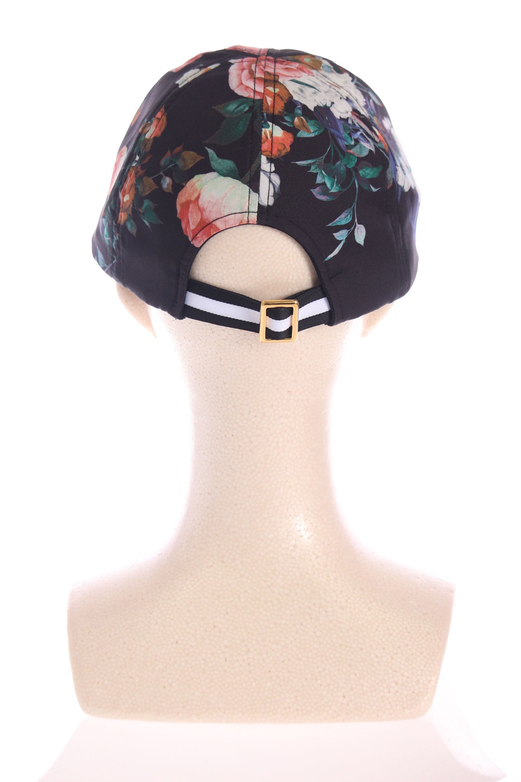 ボタニカル柄が印象的な今までにないエレガンスなキャップ。後ろのかわいいボーダー柄ベルトでサイズ調節可能です。